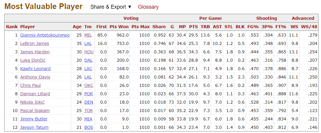Let’s compare my results to the actual 2019-20 MVP voting, here’s the voting, per Basketball Reference:
